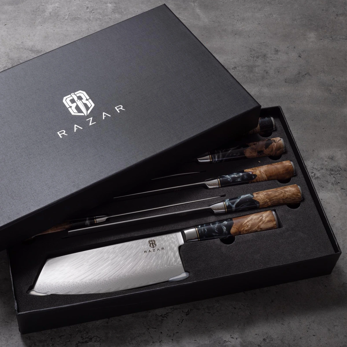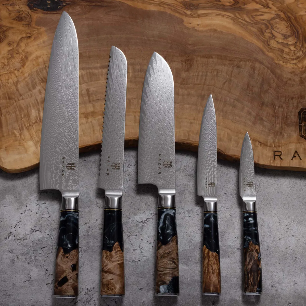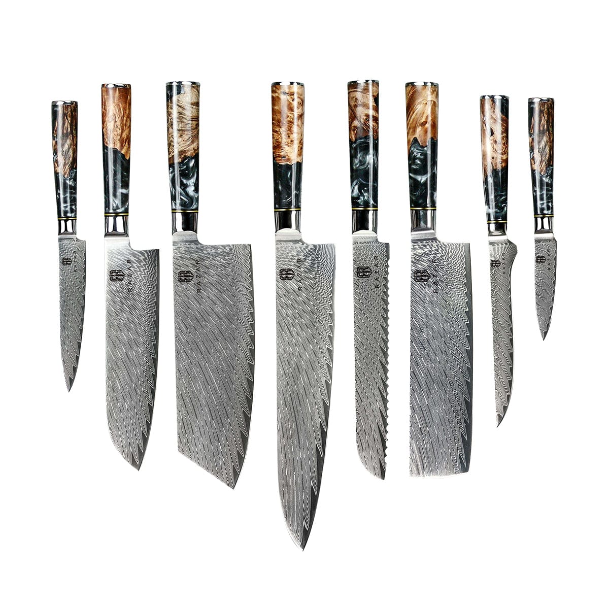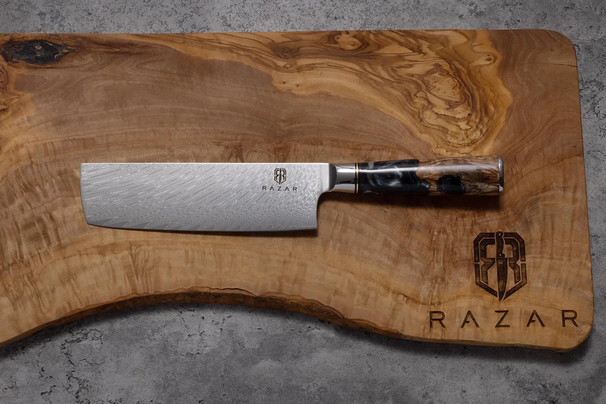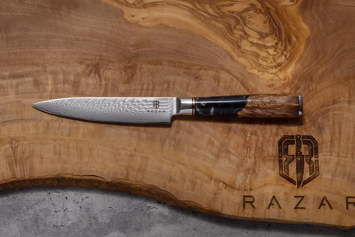 The name Azure is inspired by the enchanting blue resin and burl handle, Which differs on every knife, truly making your knife one of a kind. Combining both the Damascus blade and the resin handles its quality and sheer beauty is unrivaled.