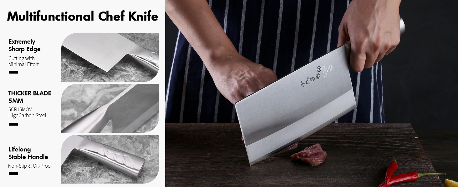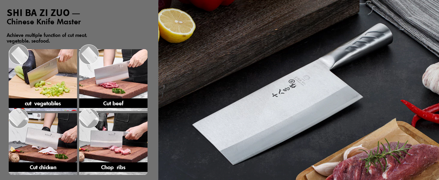It is designed for both slicing meat, vegetable and chopping small poultry bones cartilage. Even the heel of the handle is used for bashing and grinding garlic, ginger.